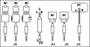 Jacks 2, 3, 4 can be connected to a box hosting an extra AC voltage source implemented as a variac with a step-up transformer of medium power (50-100W), a regulated, stabilized, floating voltage supply that can serve as negative or positive bias and a small 3-digit digital voltmetter mounted inside for convenience. Jack j1 can go directly into computer via a cable with protective diodes inserted.
