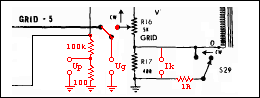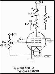 The manual [2] explains the regimes and elaborates on various procedures. Dynamic conductance is the "merit" test for which the simplified schemaic shown on the left is supplied. It is not clear how the volatges Fi1-Fi3 form, although it is apparent, after careful reading, that "Fi" stands for AC volatge. Is grid voltage in-phase with the plate voltage? Not clear, yet the fact that tester seem to measure tube parameters in AC domain, where the AC is taken directly from wall transformer, is interesting enough. Ideed, after careful reading of the full schemaic (available from [bama]), I was able to come up with this diagram, showing tube under test in Merit mode.