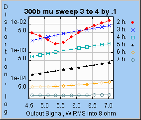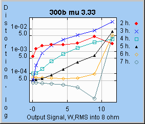 Clipping starts above 12 WRMS, which is an excellent result for a 300b SET amp. Before 10W, THD is close to 1%. Seems too good to be true, but there is an explanation for it. Note that the levels of the second and the third harmonics are comparable. I will not reveal a big secret if I tell that Randall2 as well as the original DRD by Jack Elliano employ a THD cancellation technique (THDC), and the choice of 6an4 - an unlinear device - as the driver tube was to injects "just enough" harmonics complementary to harmonics of 300b. THDC is never perfect, though. It greatly reduces 2nd harmonic but the price to pay for that is higher products, hence THDC should be used with caution. THDC changes sonic signature of SET amplifiers making them sound half way between SET and PP. Whether it is great or not so great depends on personal listening preferences. With more linear driver tube such as 6sn7 the DRD circuit would produce higher THD but the spectrum would be more "conventional" for SET amps, with 3rd that is 10..15 dB under the 2nd. Low 2nd and fairly high 3rd give DRD its characteristic sound - assertive, refined, definitely not "tubey".